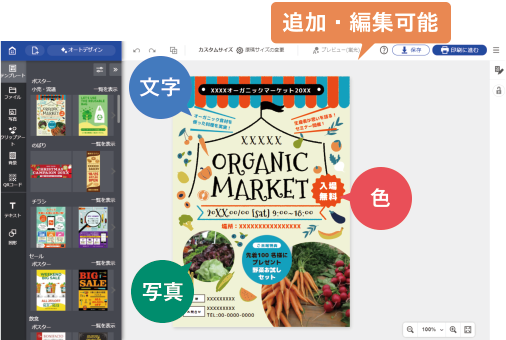 専門的な知識や操作スキルがなくても、直感的な操作で簡単にポスターやチラシ、フライヤーなどをつくれるWebアプリ。作りたいものや使う場所・目的に合わせて、初心者でも簡単にデザイン性の高いポスターなどが作成可能です。必要情報を入力するだけで自動的にデザインしてくれるオートデザイン機能をはじめ、小売、流通、サービス、飲食、文教、官公庁など、幅広い業種業務のテンプレートを豊富にご用意。ストックフォト※1も数百万点利用可能です。