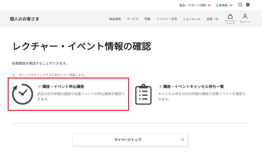 Canon.jp 個人のお客さまページより「マイページ」ボタンをクリックしてください。