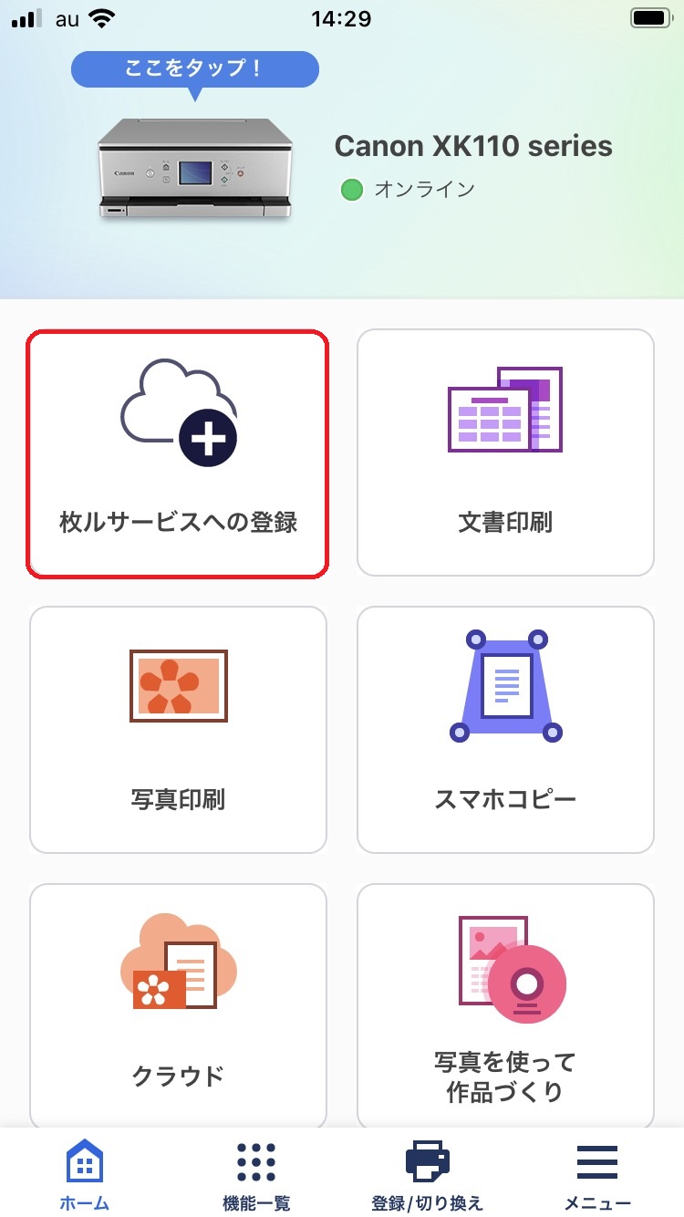 左上に表示されている[枚ルサービスへの登録]をタップしてプリンターをプリント枚ルサービスへ登録します。