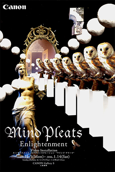 本展では、2005年10月に日本橋エリアで開催された「セントラルイースト東京2005」で発表し、話題となった体感型立体映像作品「マインドプリーツ」の新作を発表。会場3カ所に設置されたプロジェクターにより映し出される映像は、見る者の心のヒダに記憶されたさまざまな映像と感応し、不思議な浮遊感を創出させる。