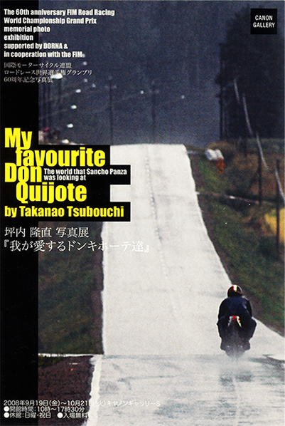 フルスロットルでオートバイを駆るライダーたちを、氏はセルバンテスの描いた「ドンキホーテ」になぞらえる。常に生命の危険を感じるレースに身を投じながらも、自分の信じる道を突き進むライダーの姿に、素朴な人間像、すなわちドンキホーテを見いだしたのだ。本展では、そんなライダーたちの人間らしさを巧みにとらえた作品約100点を展示。