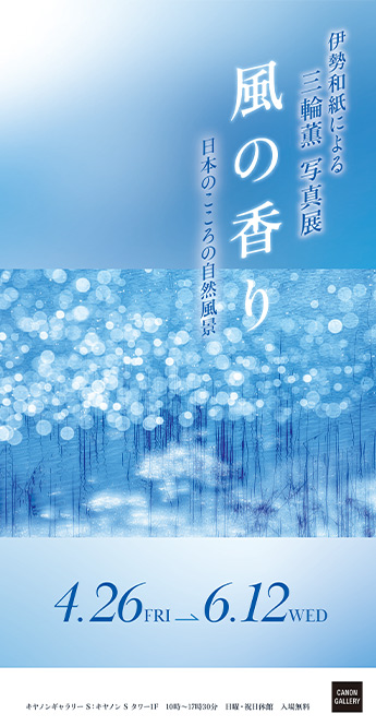 本展は、自然風景写真家 三輪薫氏の写真展です。長年にわたり日本の美しい自然と向き合ってきた氏は、和紙の持つ魅力に惹かれ、撮影した写真を和紙にプリントすることによって日本画のような柔らかい表現が特徴の作品を制作しています。本展では、氏が捉えた四季折々の自然風景を伊勢和紙の手すきの長尺などにプリントすることで、自然が見せる繊細な表情や空気感を再現した作品計35点を展示します。 展示作品は、すべてキヤノンの大判プリンター「imagePROGRAF」でプリントし展示します。