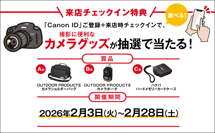 Canon IDを登録(Canonメールマガジン「myid@canon-mj.co.jp」の受信を許可)のうえ、キヤノンの直営店にご来店いただき、店頭にてチェックインいただいた方を対象に、撮影に便利なカメラグッズを抽選でプレゼントいたします。