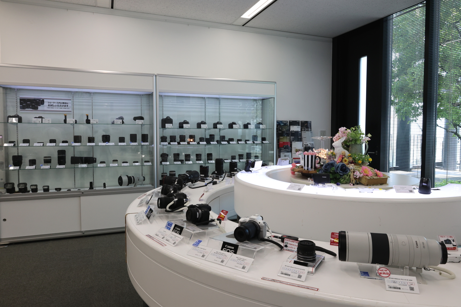 ミラーレスカメラ、一眼レフカメラ、交換レンズ、アクセサリーを展示しています。