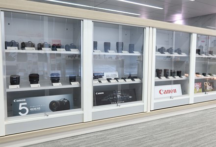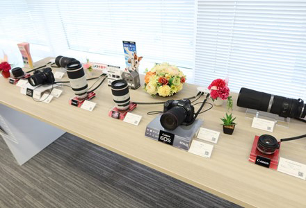 ミラーレスカメラ、一眼レフカメラ、交換レンズ、アクセサリーを展示しています。